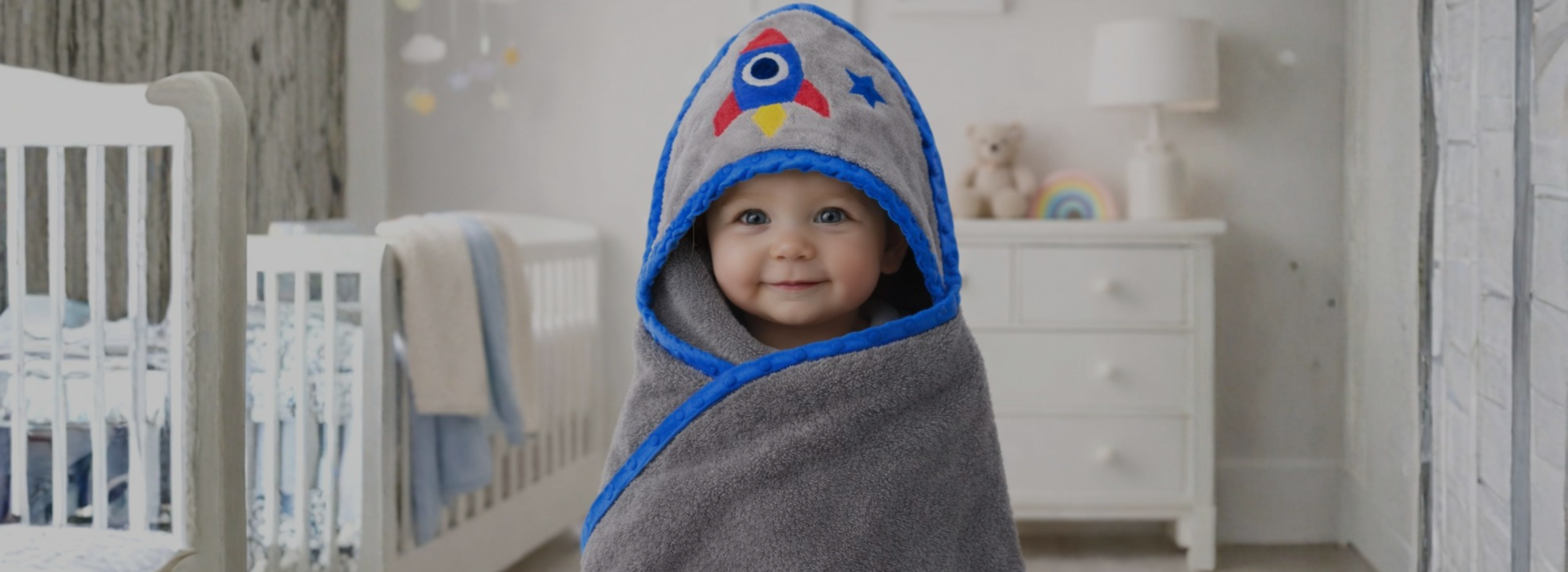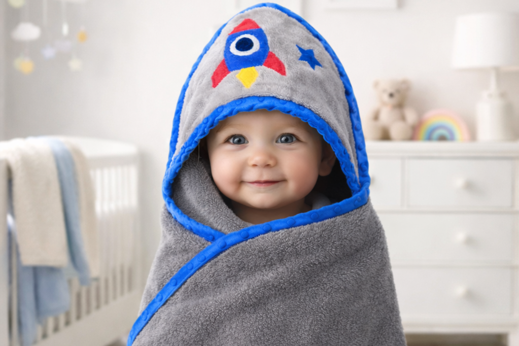 Wrap bath time up with a little adventure. Our Rocket Ship Hooded Towel keeps your baby warm and cozy while the hood helps dry hair fast. Made for everyday use and gift-ready for baby showers—because comfort should look cute too.